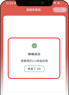 注意:港鐵乘車碼僅適用於香港地鐵,若乘搭巴士或其他交通工具,請點選「乘車碼」使用服務。