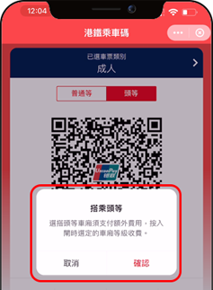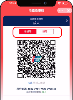 在港鐵乘車碼服務頁面,直接選擇合適的座位等級