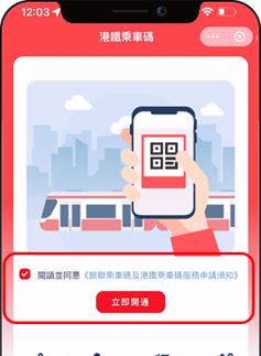 勾選「閱讀並同意《港鐵乘車碼服務用戶協議》」,然後按「立即開通」