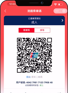 雲閃付App已開通香港本地乘車碼服務,雲閃付App用戶現可憑乘車碼搭乘香港全線港鐵、九巴、龍運以及新巴、城巴線路。未來,乘車碼將擴展至等其他交通工具,雲閃付App也將可應用於電車和渡輪,為持卡人提供更加安全、高效、便捷的乘車體驗。